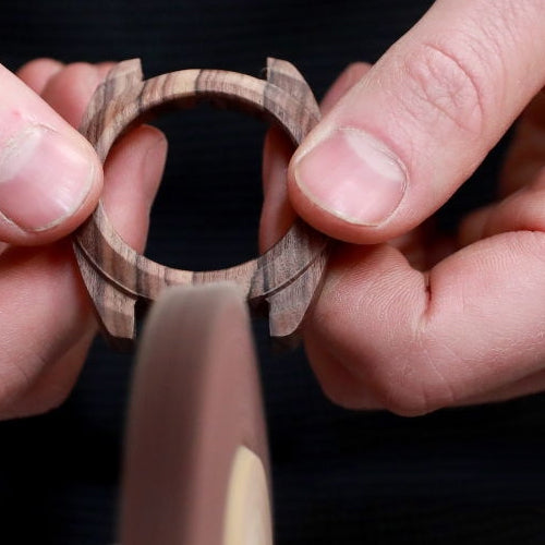 On contrôle le bois, on polit le boîtier, on ajuste le bracelet en acier inoxydable.